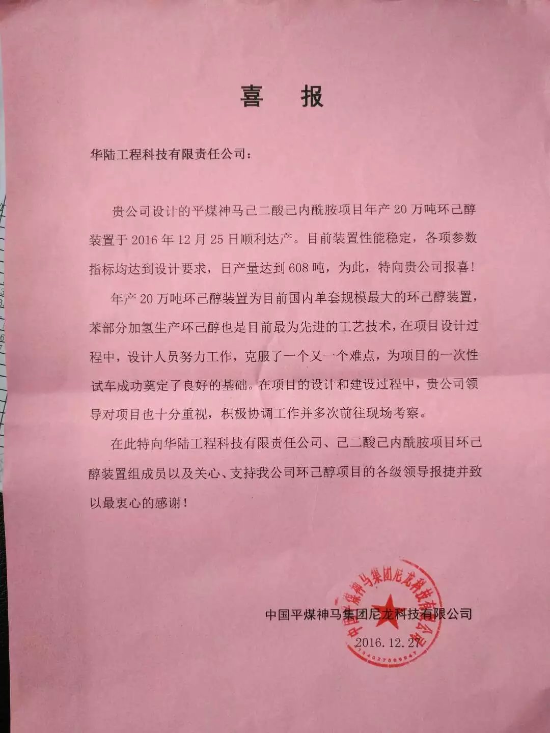 2016年12月25日,华陆公司设计的中国平煤神马集团尼龙科技有限公司年产20万吨环己醇装置顺利达产,目前装置性能稳定,各项参数指标均达到设计要求,日产量达到608吨。该装置是目前国内单套规模最大的环己醇装置,苯部分加氢生产环己醇也是目前最为先进的工艺技术。