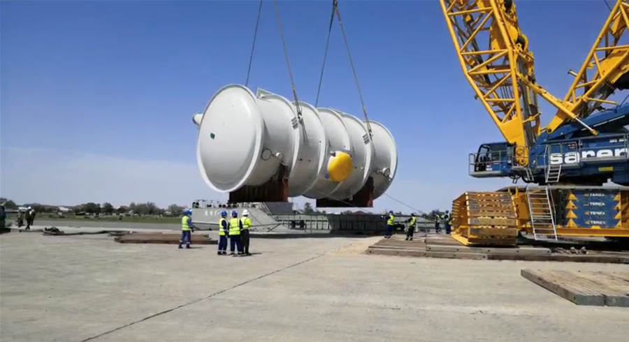 由于当前乌拉尔河正值禁渔期,为了能够保障反应器顺利运输,项目物流人员积极与业主、物流公司等进行多次协调沟通,最终获取了禁渔期内的运输许可。经过艰苦努力,项目团队顺利完成了本批次设备第一艘驳船的运输工作,按照工作计划,待8台反应器全部到达港口后,将使用液压轴线车将反应器经由阿特劳市区转运至卡拉巴丹项目现场。